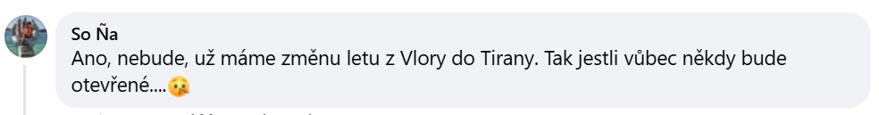 "Už máme změnu letu z Vlory do Tirany. Tak jestli vůbec někdy bude otevřené," uvedla jedna z Češek na sociální síti Facebook po uživatelským jménem So Ňa a dodala, že dovolenou v Albánii si už podruhé s příletem do Vlory objednala od ČEDOKu.